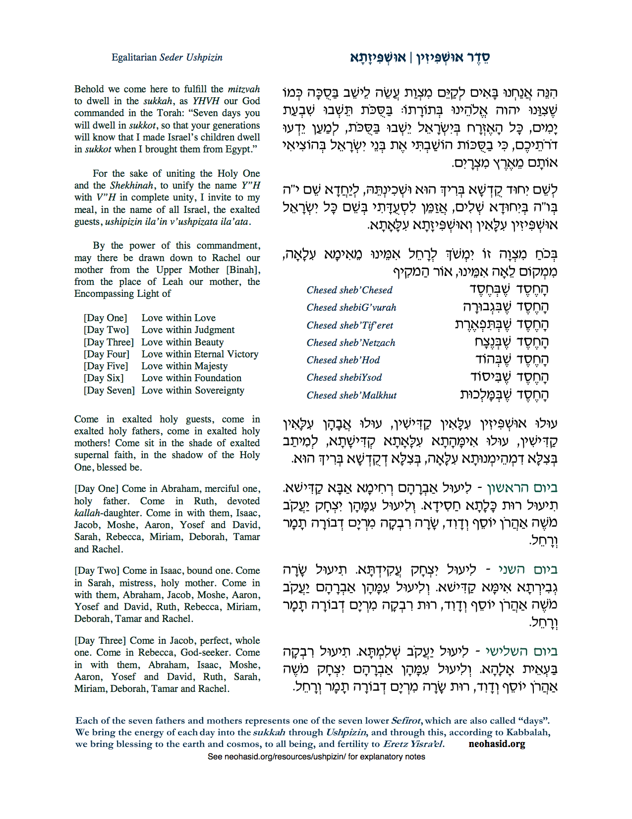 The following liturgy for inviting the mothers and the fathers to the sukkah is given in Hebrew and Aramaic in neohasid’s 2-page pdf, revised for 2014. Pictures of the liturgy are found below, followed by the entire English text. For an explanation of the order and description of the mothers given in this liturgy, visit NeoHasid’s Ushpizin Resources page.